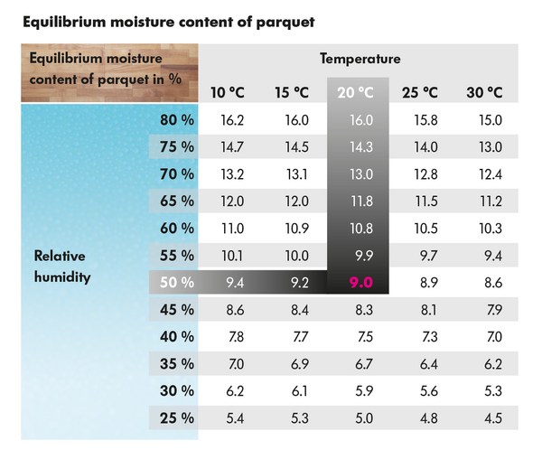 The wood moisture of parquet always adjusts to the existing ambient conditions. Single-layer parquet made of solid wood must therefore be installed with a moisture content of 9 (± 2) %, multi-layer parquet with 8 (± 2) %. In addition, an air temperature of approx. 20 to 22 °C with a relative humidity of approx. 50 to 60 % must be observed.